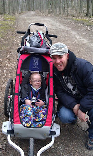 On Good Friday, we went up to Hilton Falls for a little family hike. We had never been there before so we thought we would check it out. I was a bit iffy about going, but figure that a 4km hike into the falls and back out would not be that bad if we just took our time. A loves his bike trailer and had so much fun on the hike. Mommy however was not feeling too hot by the time we were done. My back was sore and I told J that there would be no more family hikes until we were a family of four!